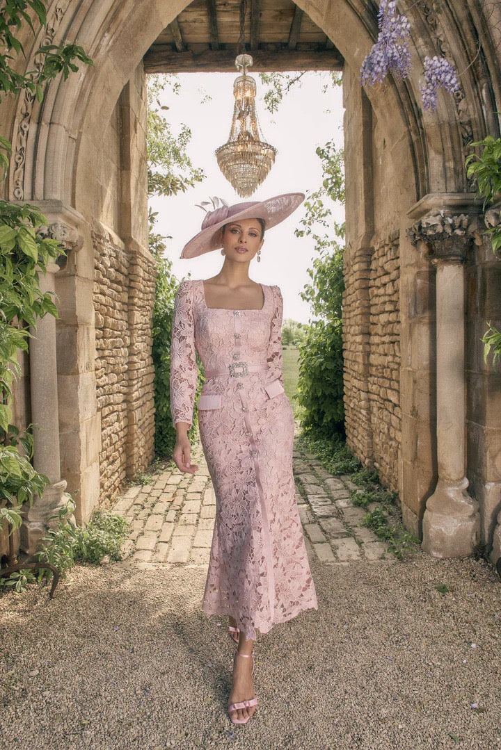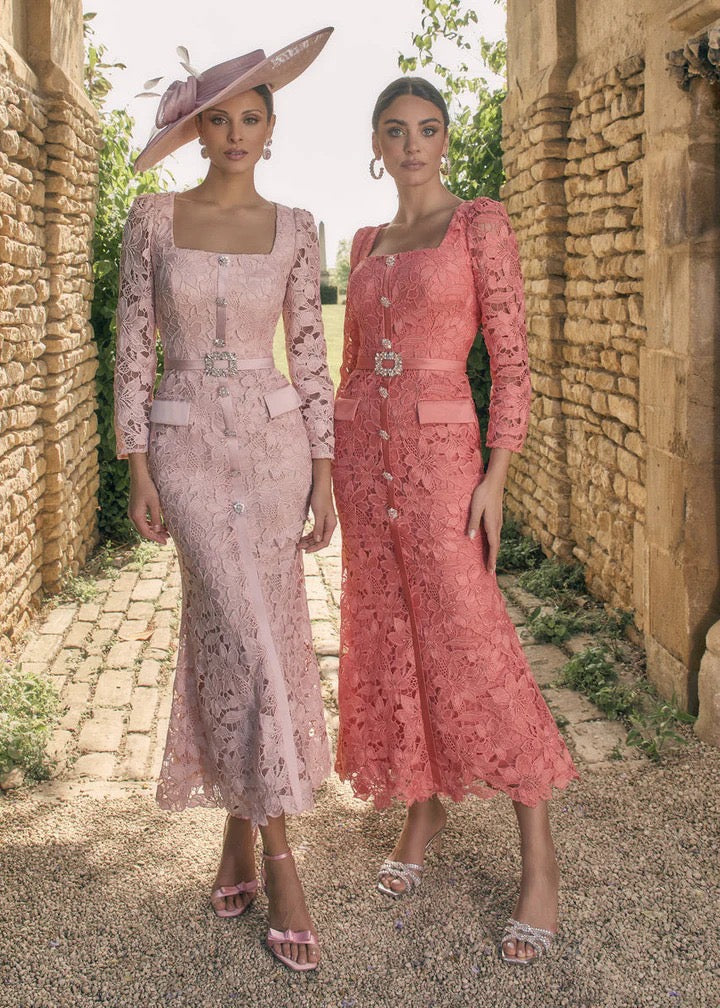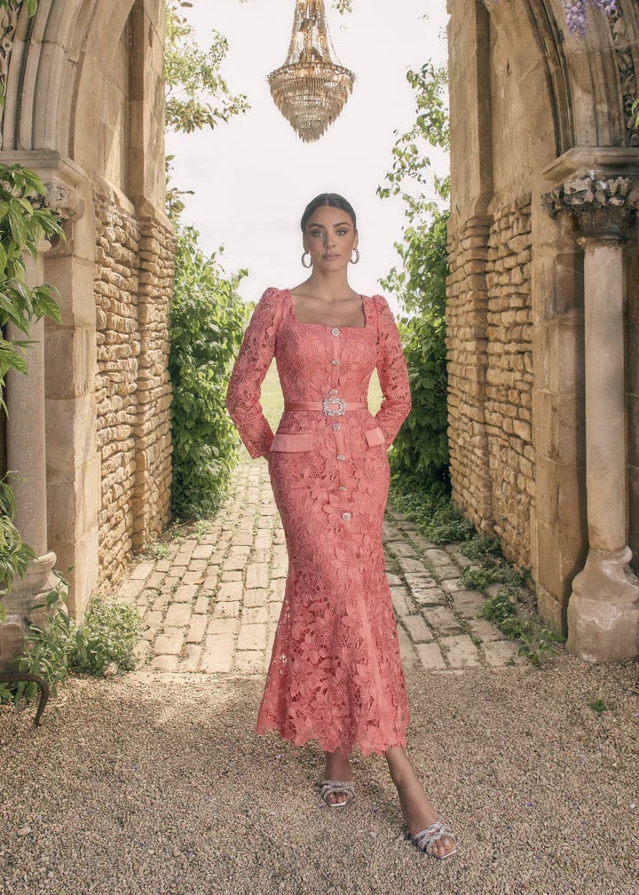 Abito midi in crepe di pizzo, decorato con uno scollo quadrato e lusinghiero, abbottonatura frontale e delicate maniche lunghe. Cintura in vita con fibbia in cristallo.