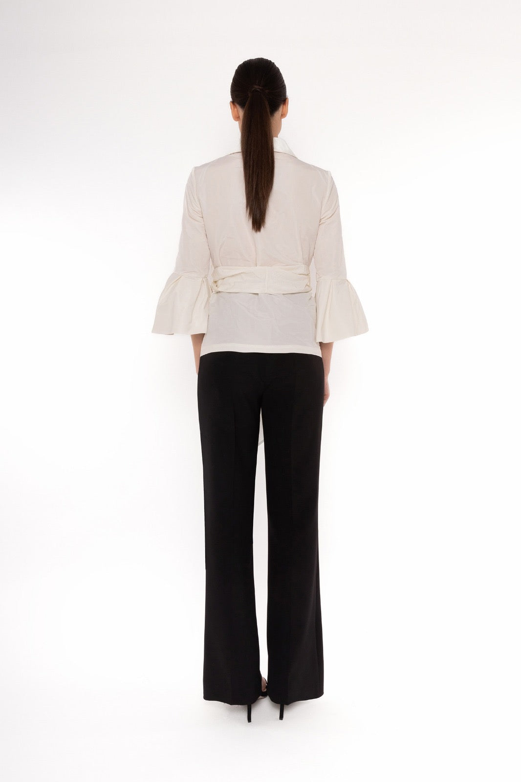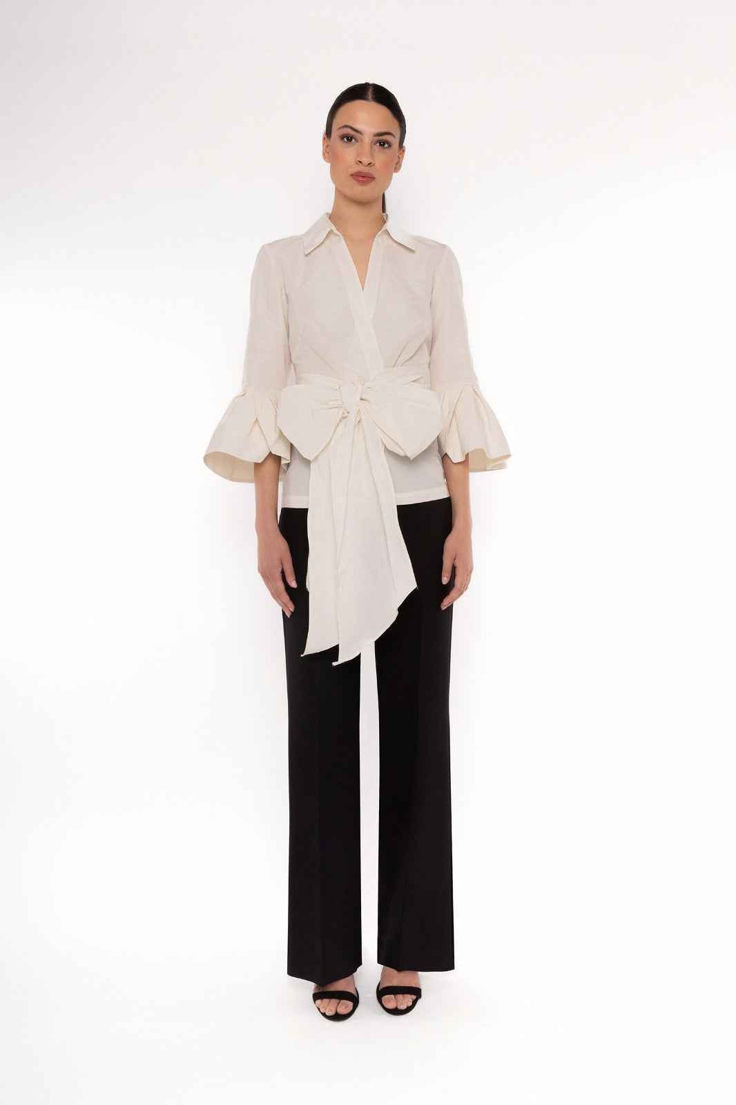Camicia raffinata dal taglio femminile, caratterizzata da scollo con colletto, maniche a balze e cintura con fiocco in vita che valorizza la silhouette. Perfetta per look eleganti e professionali, da abbinare a pantaloni o gonne.