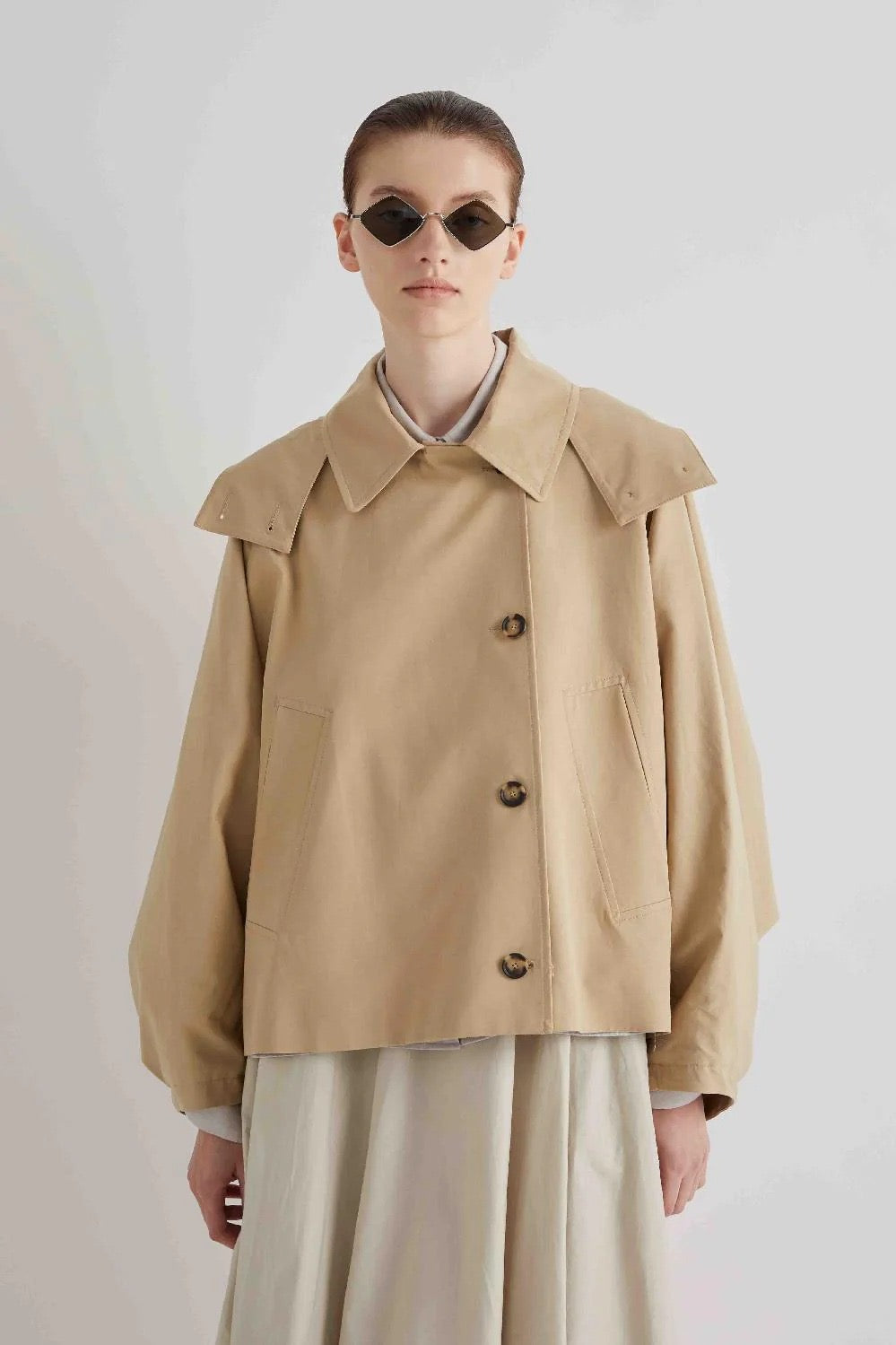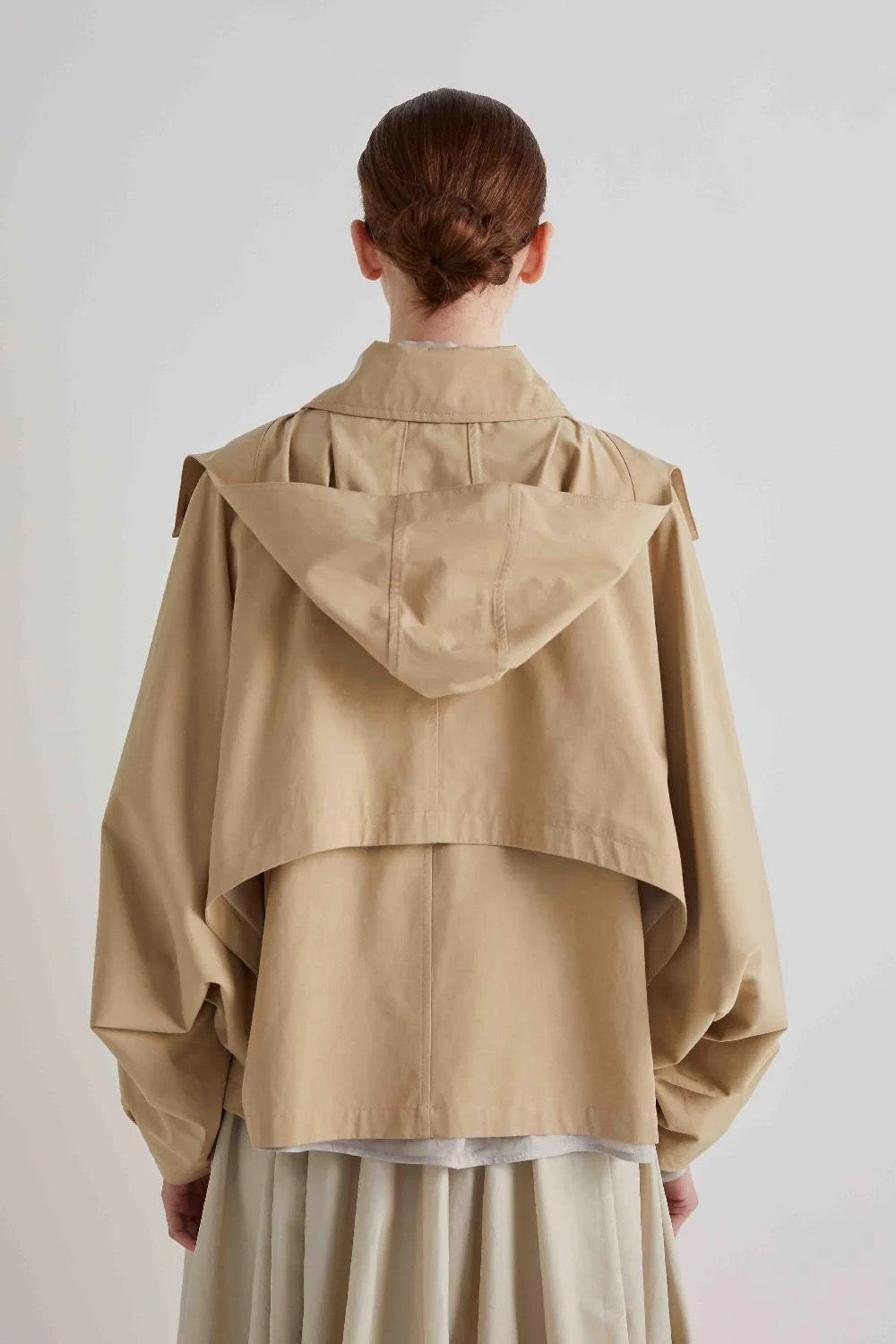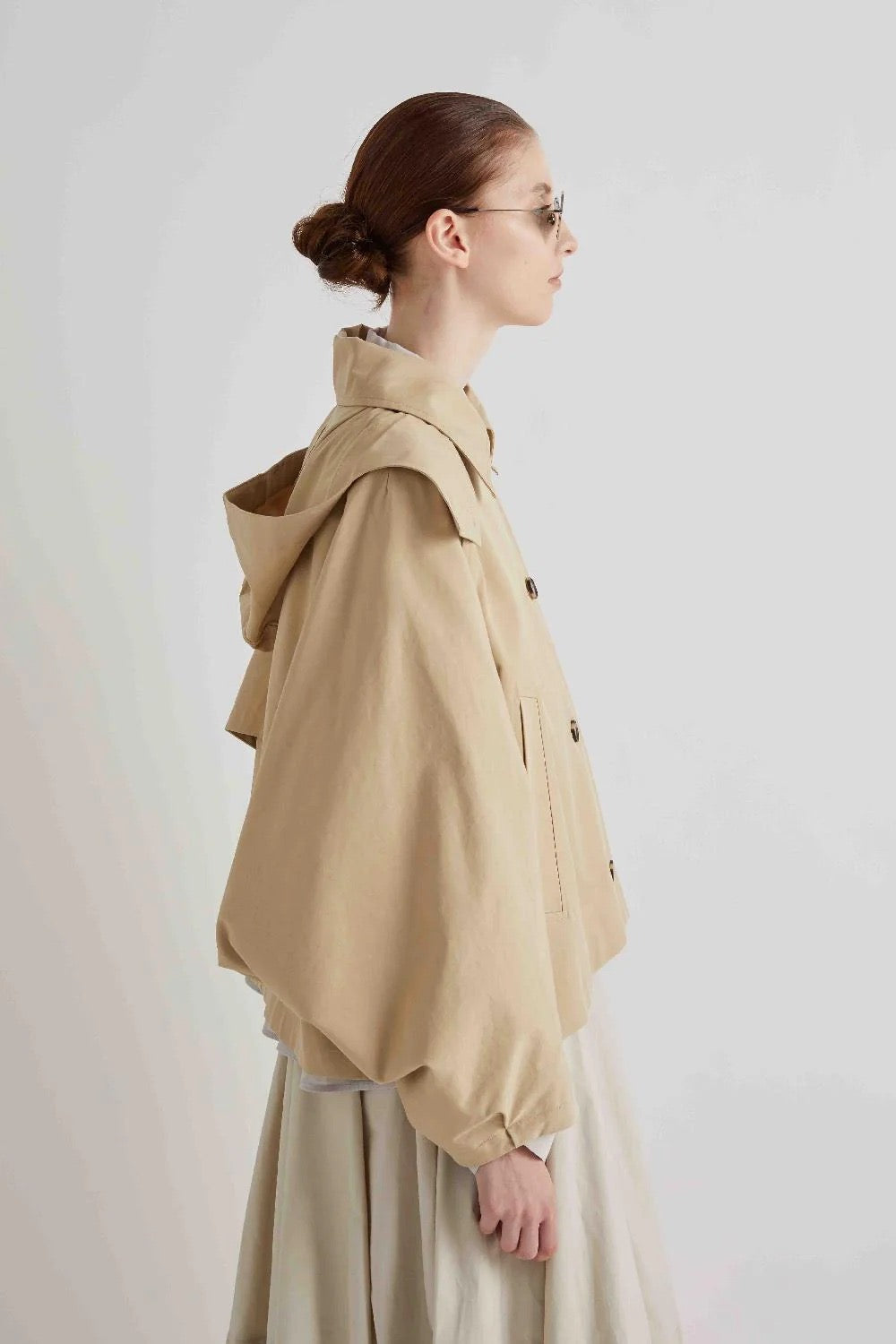 Ampio giubbino corto con cappuccio staccabile, collo classico a camicia, manica a pipistrello e tasche a filetto sul davanti. Chiusura frontale con bottoni.