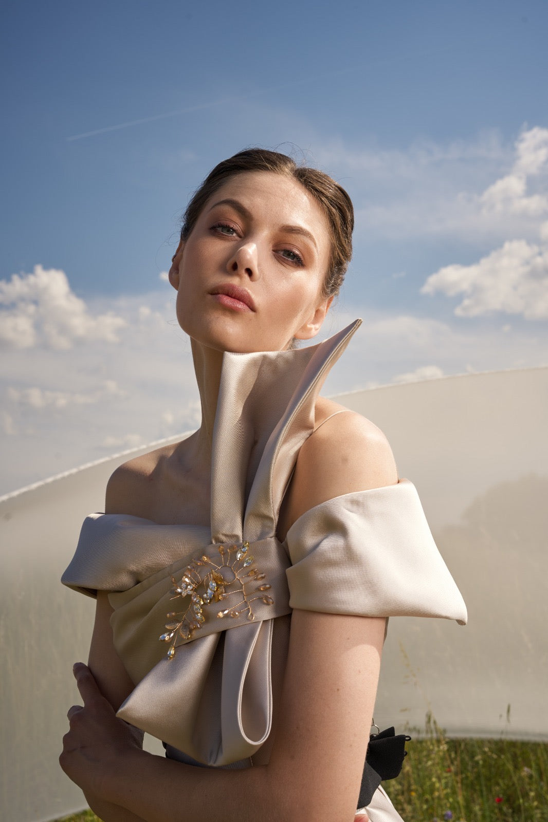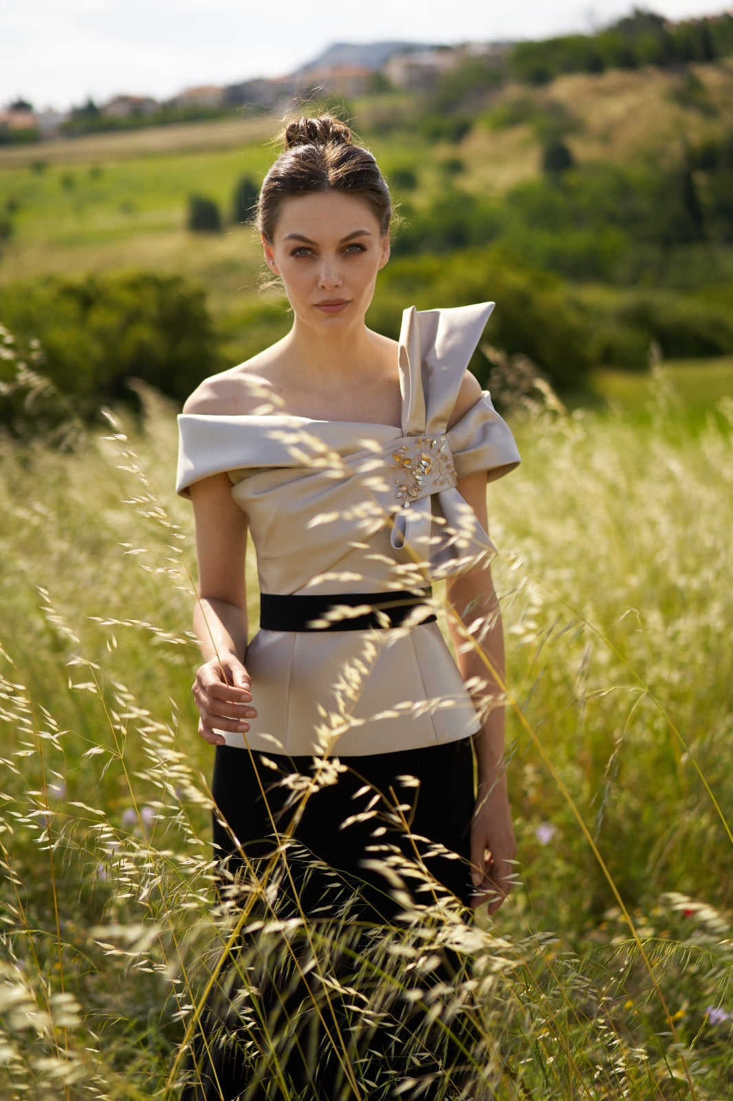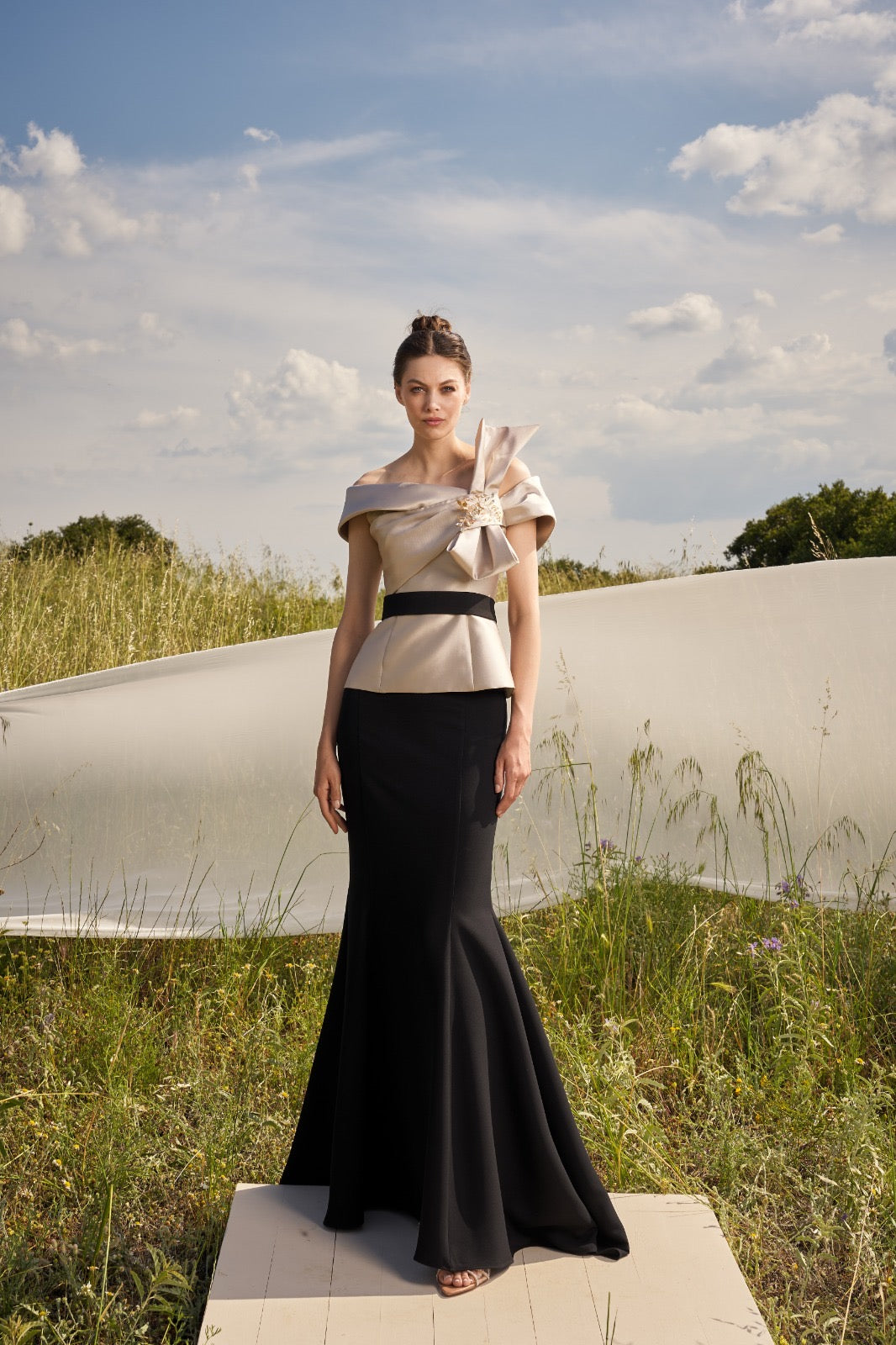 Completo sofisticato composto da top strutturato off-shoulder con maxi fiocco decorativo e cintura a contrasto, abbinato a una gonna lunga dalla linea fluida. Il gioco bicolor dona carattere e raffinatezza, creando una silhouette slanciata ed elegante.