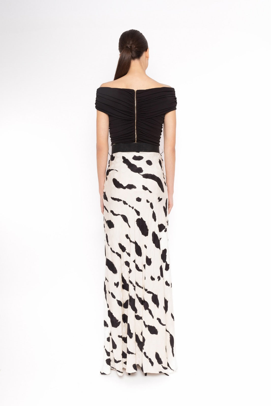 Gonna lunga in tessuto fluido con elegante stampa astratta bianco e nero. Vita alta per valorizzare la silhouette e linea morbida che slancia la figura. Perfetta per look eleganti, cerimonie ed eventi speciali.