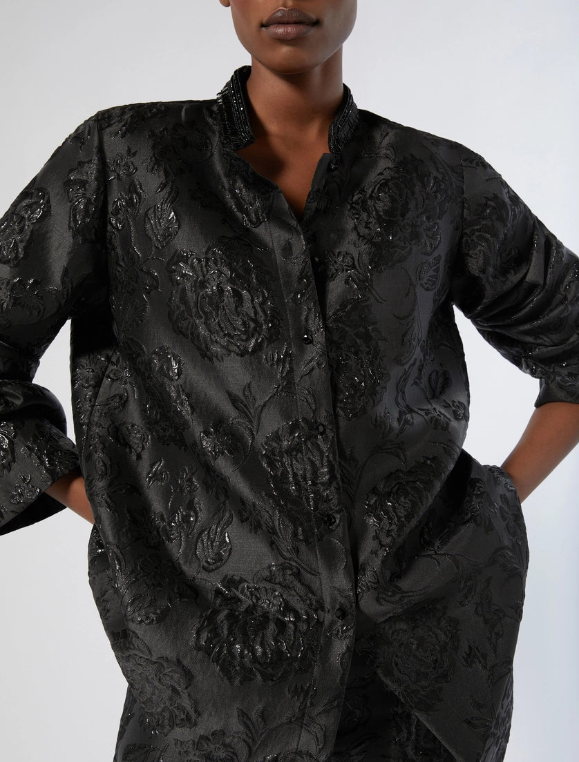 Eleganza magnetica per la casacca aperta in tessuto jacquard con bottoni gioiello. Il collo alla coreana è rifinito da ricamo di jais.