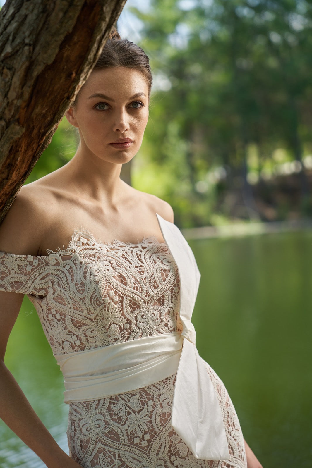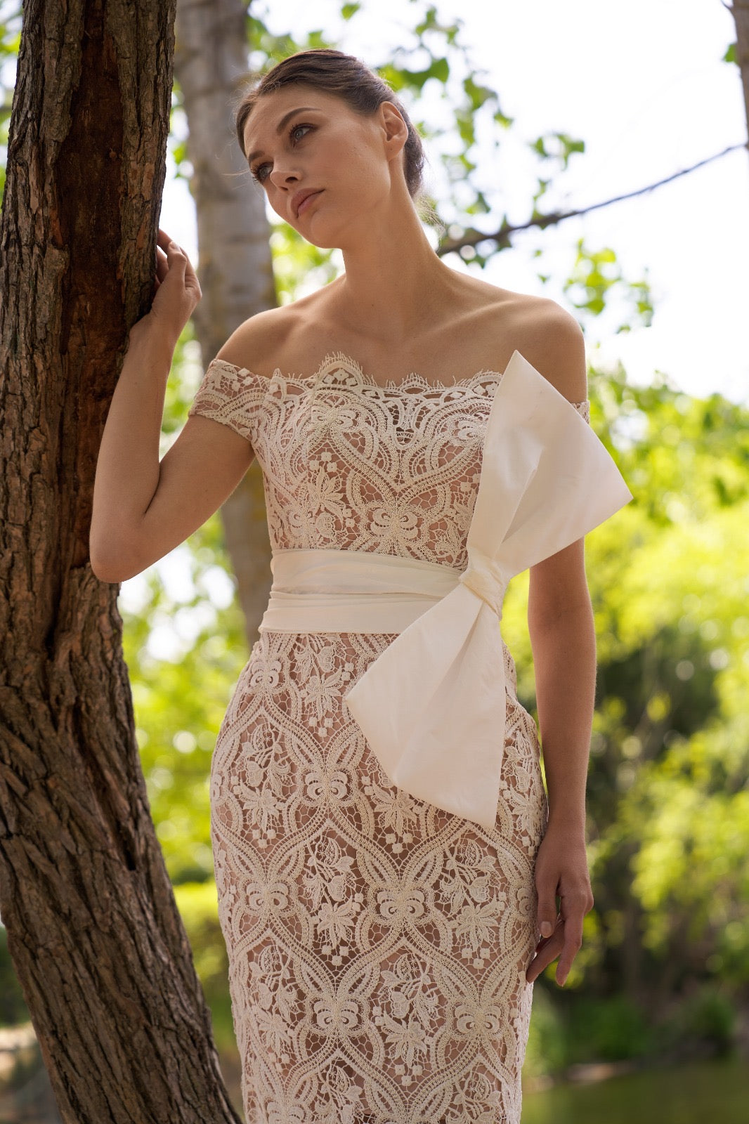 Abito elegante in pizzo lavorato, dal design raffinato e femminile. Il modello off-shoulder valorizza le spalle, mentre la silhouette aderente segue delicatamente le forme. Il punto focale è il fiocco strutturato in vita, che aggiunge un tocco moderno e sofisticato.