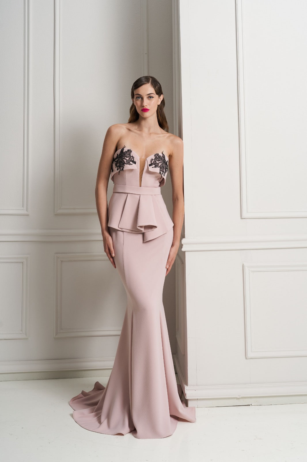 Completo raffinato color cipria composto da top con scollo a cuore, impreziosito da delicati dettagli in pizzo sulla scollatura. Il top presenta una cintura in tessuto in vita e una balza morbida che dona movimento e armonizza la silhouette. La gonna lunga, leggermente svasata sul fondo, completa il look con eleganza e femminilità.