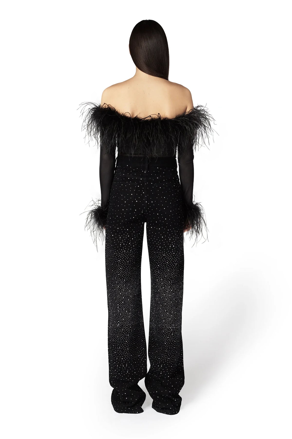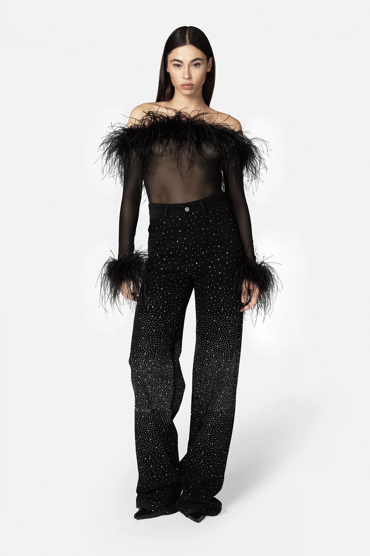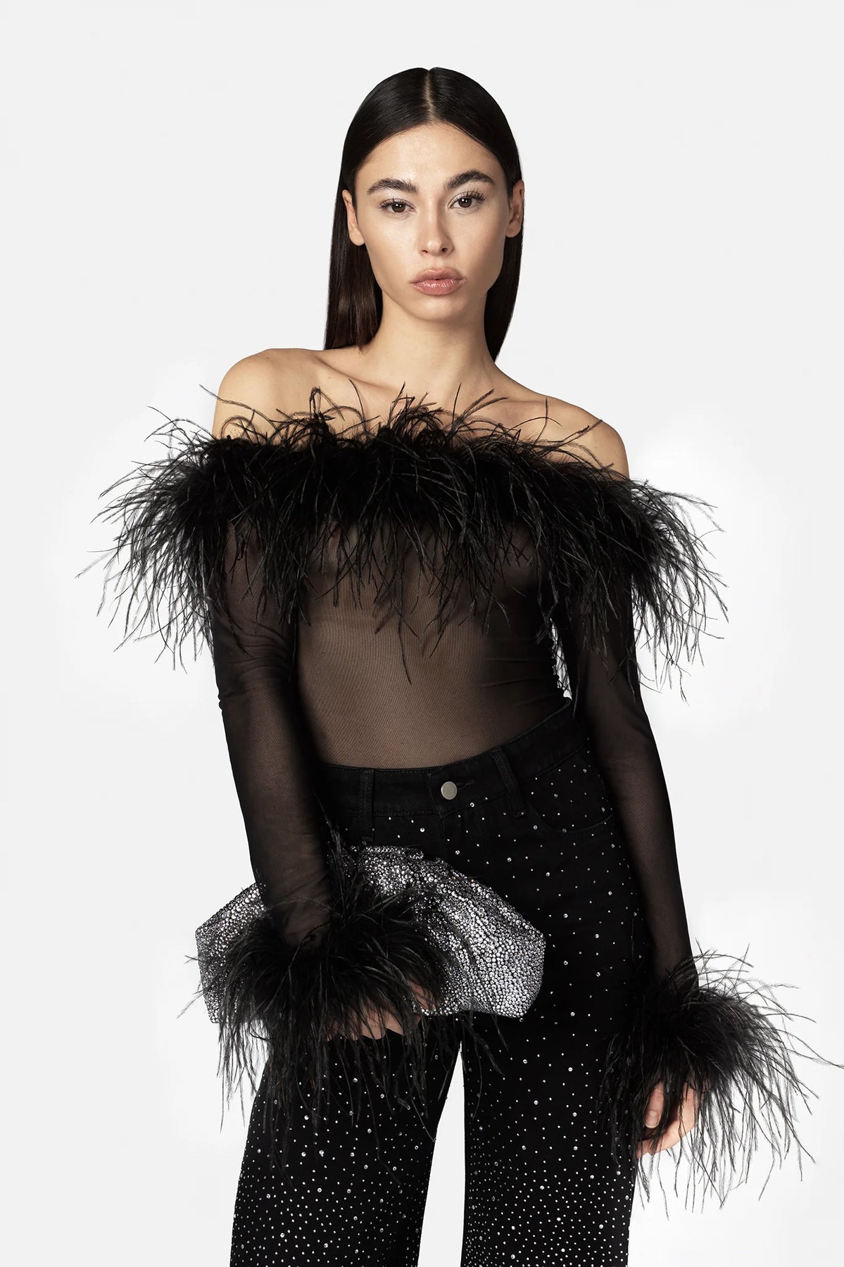 Body Zuben in tulle elastico nero con chiusura classica, scollo barca con boa piume su scollo e su polsi removibile con bottoncini nascosti.